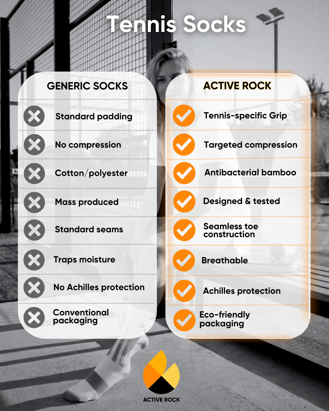 Experience the Active Rock difference — our tennis socks are crafted for athletes who expect more from their gear. Unlike generic options, Active Rock tennis socks deliver sport-specific grip, targeted compression, and the comfort of antibacterial bamboo fibers.